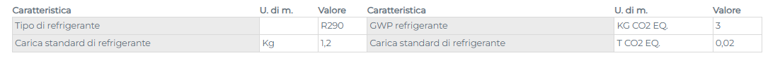 - Utilizza R290, un refrigerante ad impatto quasi nullo sul riscaldamento globale (GWP 0.02) e